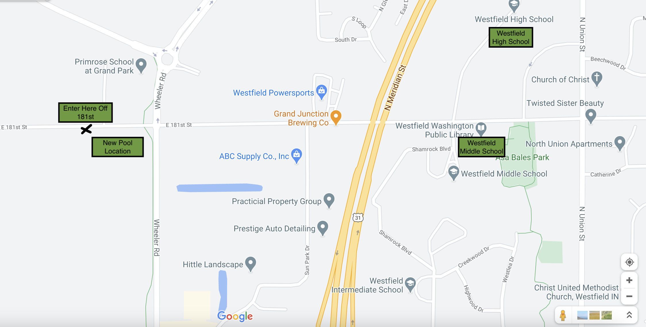 Directions: The Natatorium is located at the southwest corner of Wheeler Road and 181st Street in Westfield, IN. This is a stand alone building just west of Westfield High and Middle Schools.